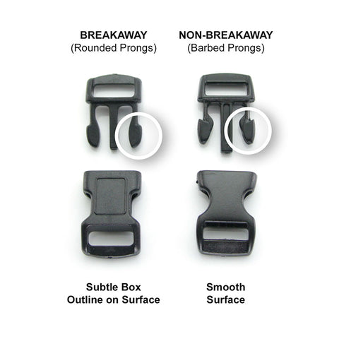 "Buckle Type" refers to the black or white standard plastic side-release clasp shown in all collar product photos in our store. On every collar product page, you will be given the option to select whether you prefer a "Breakaway" or "Non-Breakaway" plastic buckle clasp. Both types look the same as what you see in the photos — the difference has to do with the internal pronged mechanism, which makes them function differently. See the illustration below to compare the visual differences. Please Note: The details regarding the differences shown below will apply whether it's pertaining to a white or black buckle clasp: